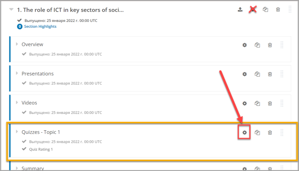 Бағалау қойылатын бөлімшені табыңыз. Баптаулар панелін ашу үшін тісті дөңгелек белгішесін басыңыз. - Мысалы, квиздер, зертханалық немесе практикалық жұмыстар